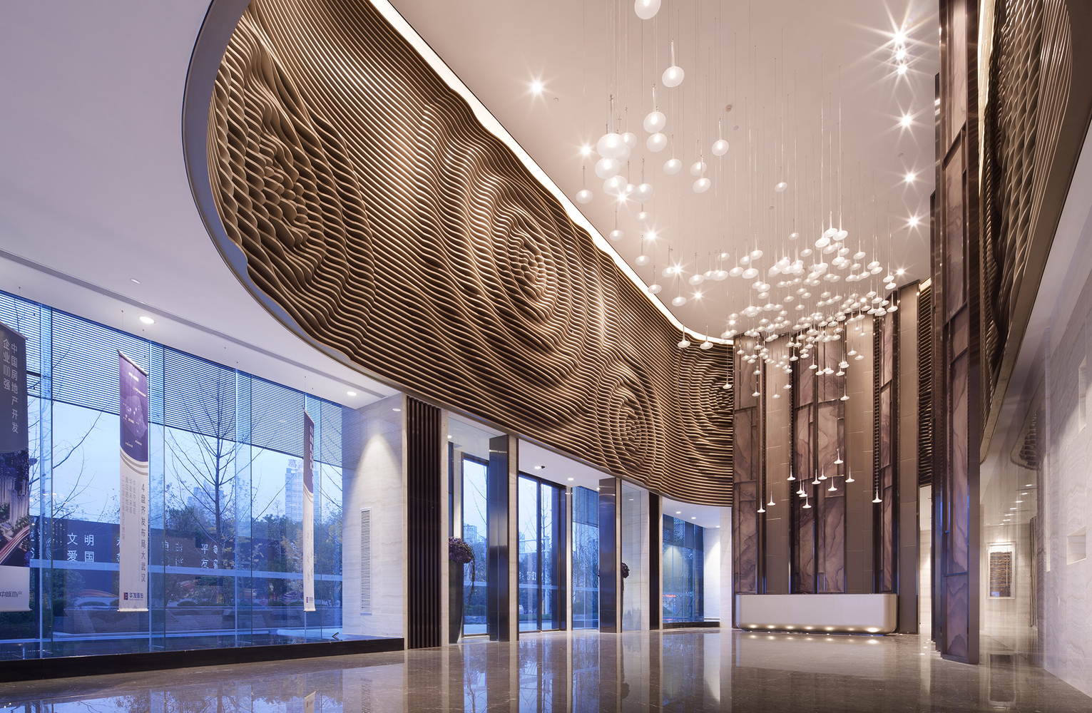 伯牙以琴遇見(jiàn)子期;李白以詩(shī)遇見(jiàn)杜甫;而當(dāng)華發(fā)·中城薈落地武漢CBD,它又該以何種方式與武漢產(chǎn)生對(duì)話連接?收藏這幅畫!由室外水景透視 . Image © JING Xu-Feng由室外水景透視 . Image © JING Xu-Feng收藏這幅畫!入口接待區(qū). Image © JING Xu-Feng入口接待區(qū). Image © JING Xu-Feng不想脫離武漢去臆造一個(gè)毫無(wú)關(guān)系的風(fēng)格,所以我們對(duì)在地文化進(jìn)行了深度考察。東湖雨后湖面泛起的漣漪激發(fā)了設(shè)計(jì)師靈感,也讓我們找到了答案——水。江河縱橫、湖港交織的武漢,水,既見(jiàn)證了它的繁榮與發(fā)展,也滋養(yǎng)孕育了它幾千年的歷史人文。這一次,我們意圖營(yíng)造的,是一個(gè)以水為題、 潤(rùn)物無(wú)聲的自然空間。 -