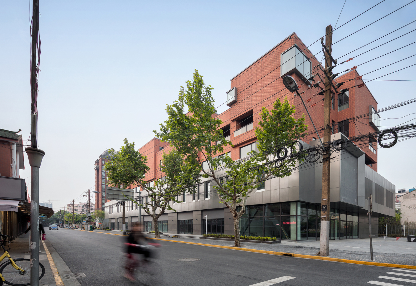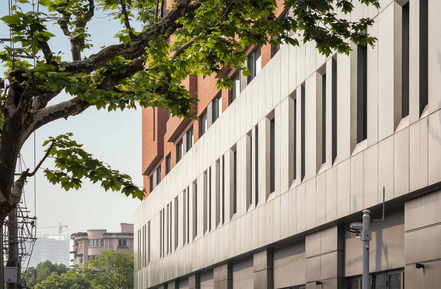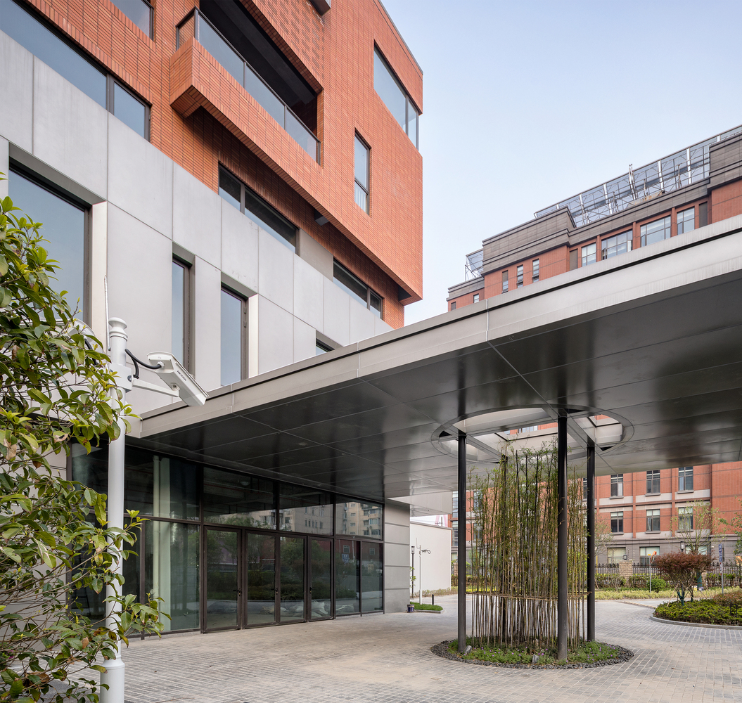 沈陽路月子中心包含了一家含40余間居室的月子會所、少量商鋪以及一個小型醫(yī)美診所。項目位于上海楊浦區(qū)老城廂內(nèi);周邊環(huán)境新舊夾雜,既有上世紀(jì)各個年代上海住宅的陳列,也有紅房子醫(yī)院等大型建筑對城市空間的剽悍介入和割裂,顯得雜亂而豐富。在這樣一個環(huán)境中,建筑自身的秩序感和景觀資源的內(nèi)向化成為設(shè)計的主要策略